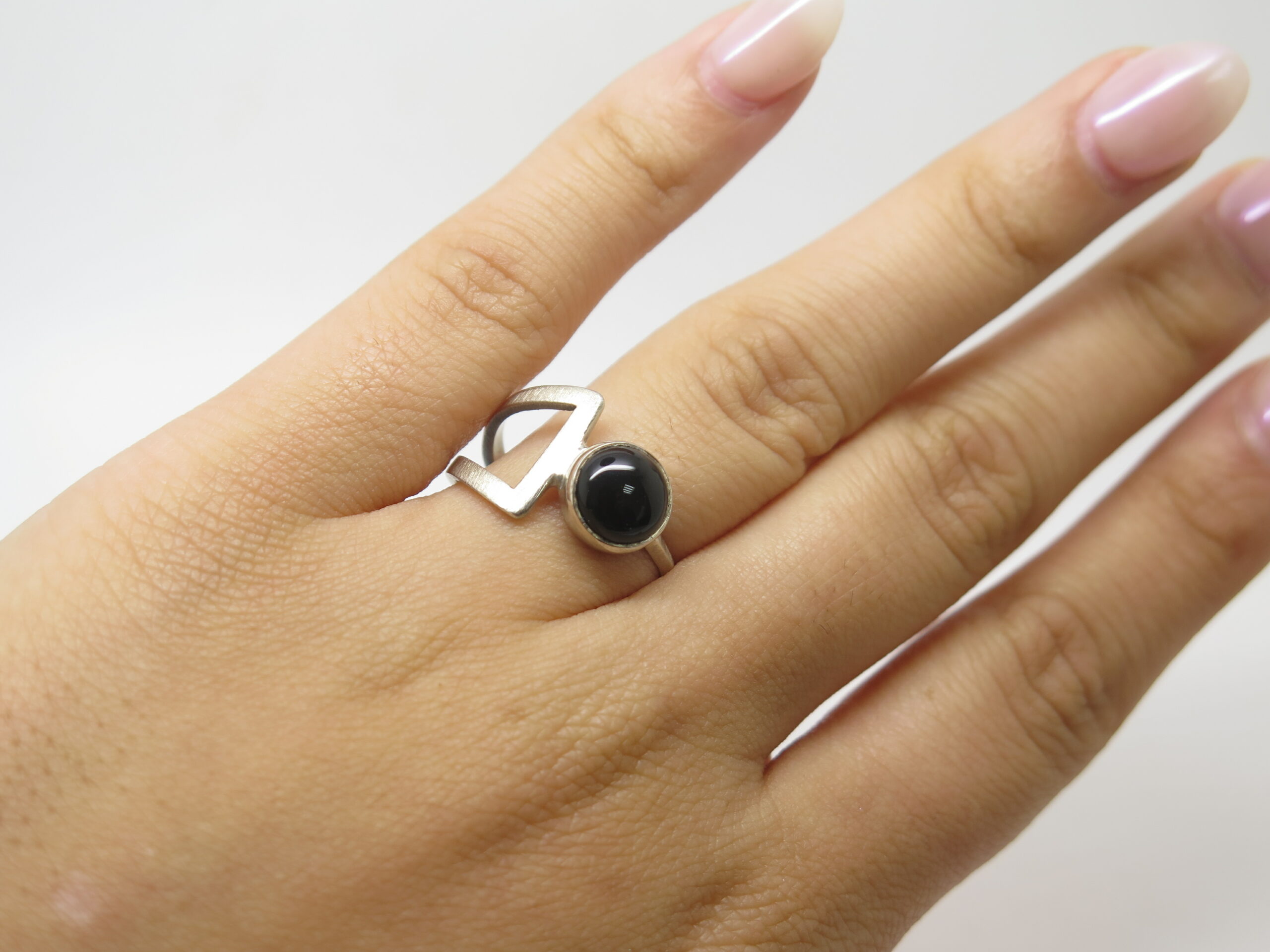 Son motif ajouré laisse apparaître la peau à travers le bijou. Celui-ci est orné d’un cabochon d’onyx.