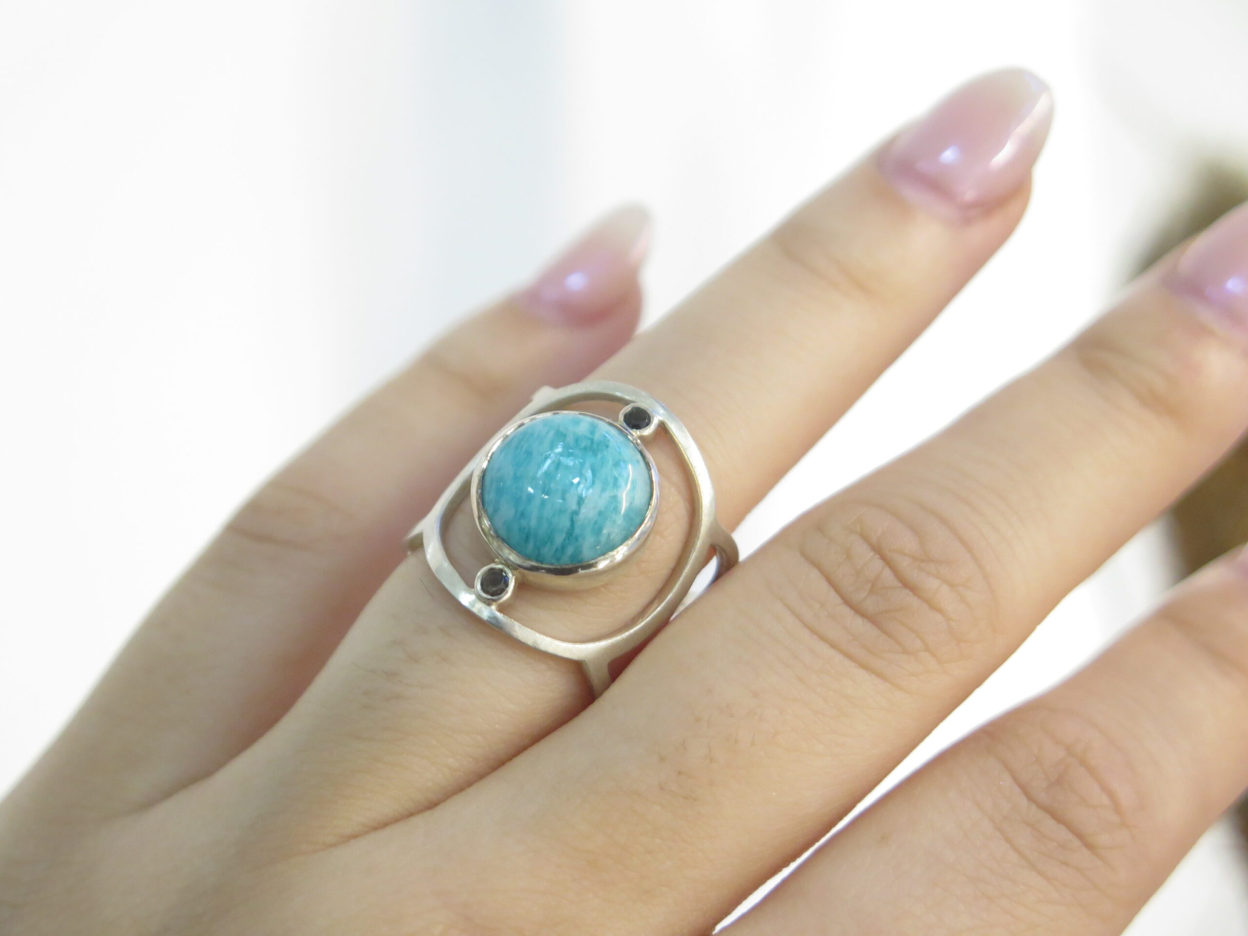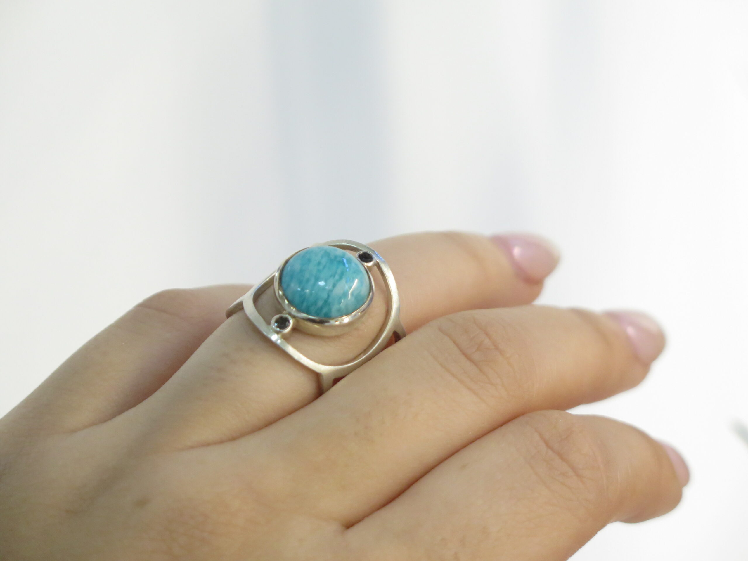 Cette bague large en argent ajouré est ornée d’une amazonite entourée de deux quartz fumés facettés.