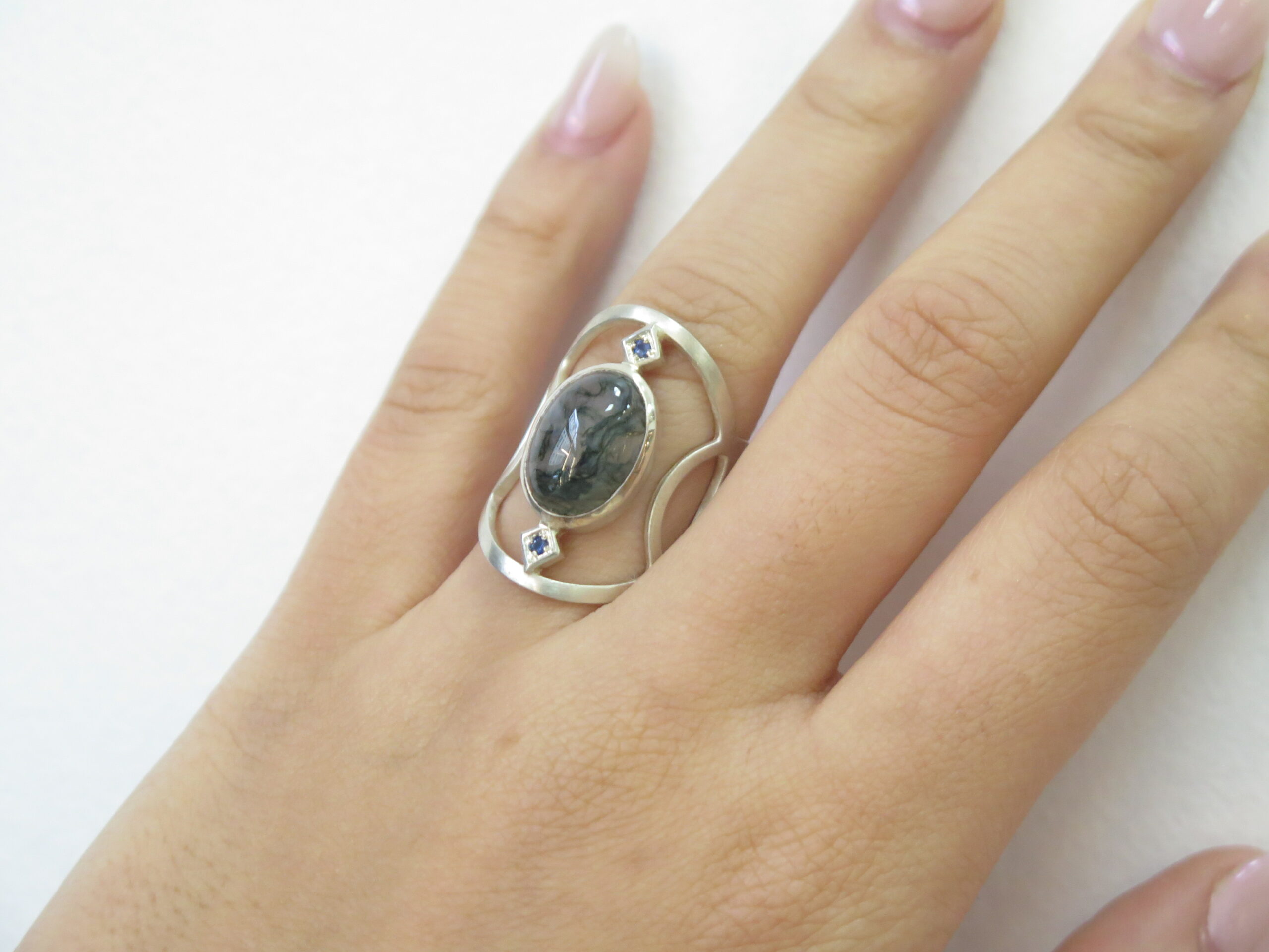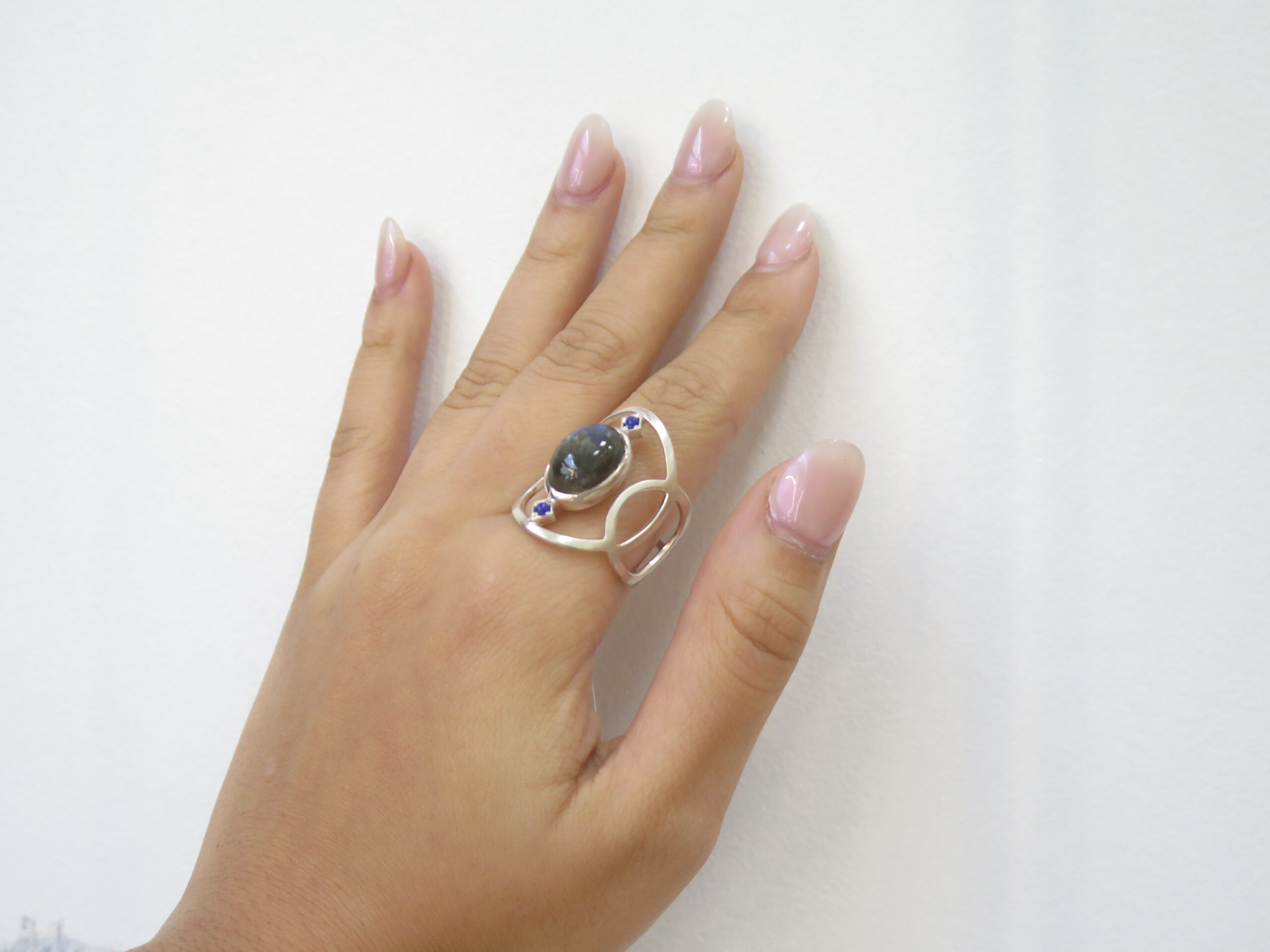 Cette bague large est ornée d’une labradorite et de deux lapis-lazulis.