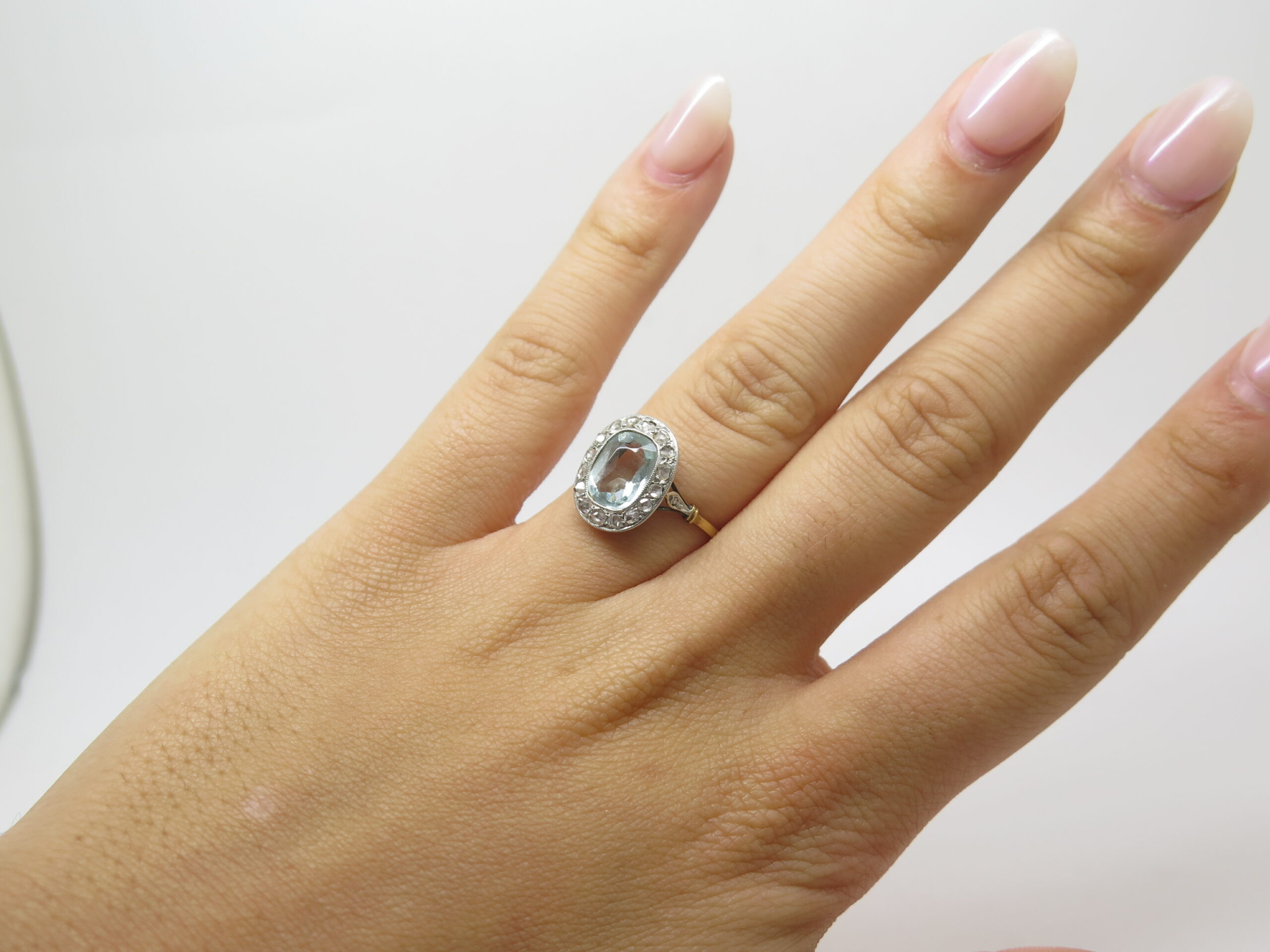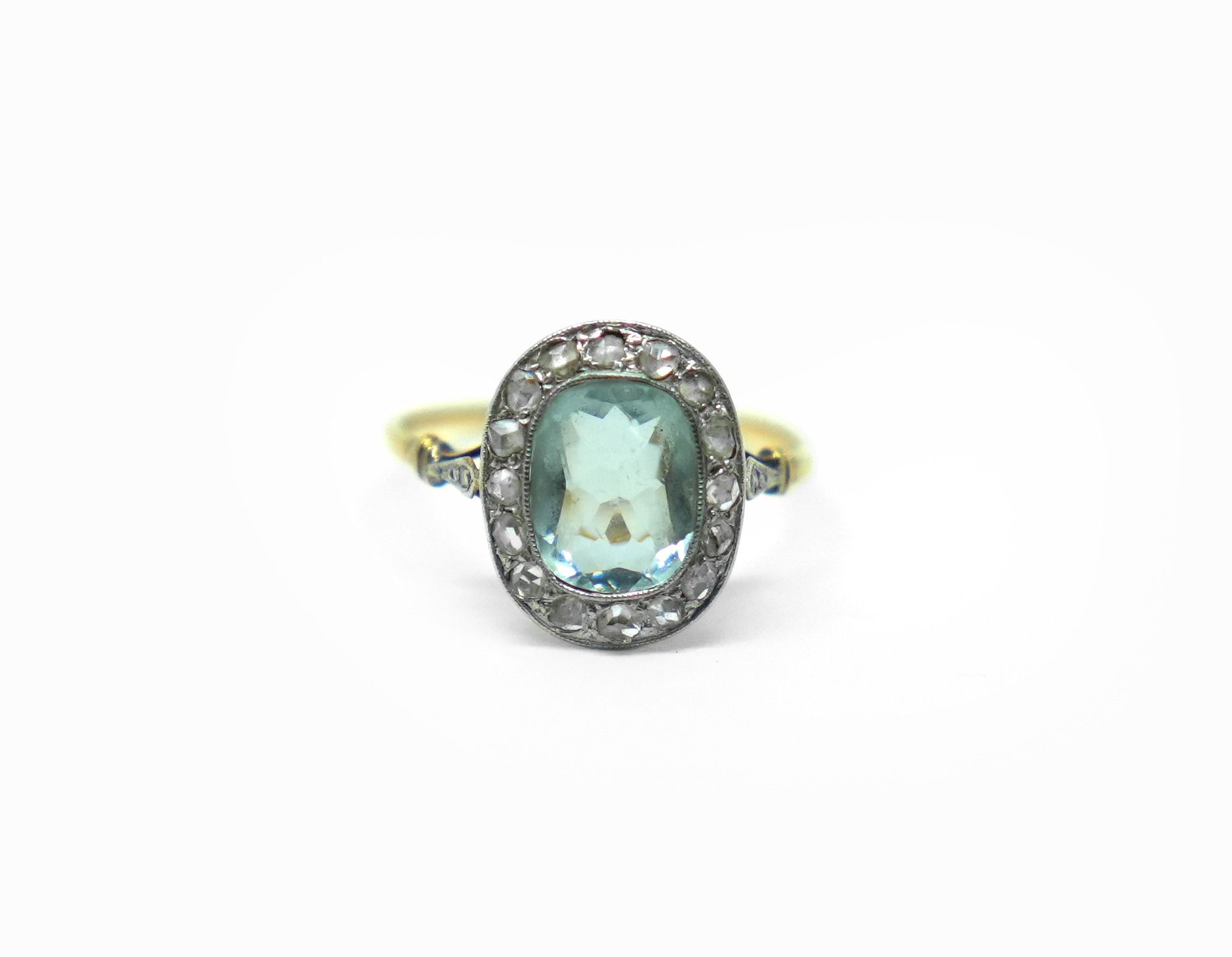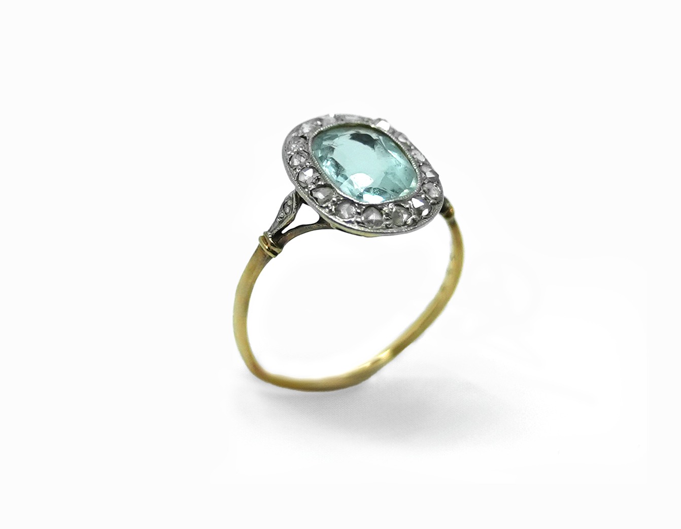 Jolie bague à entourage sertie d’une aigue marine ovale.