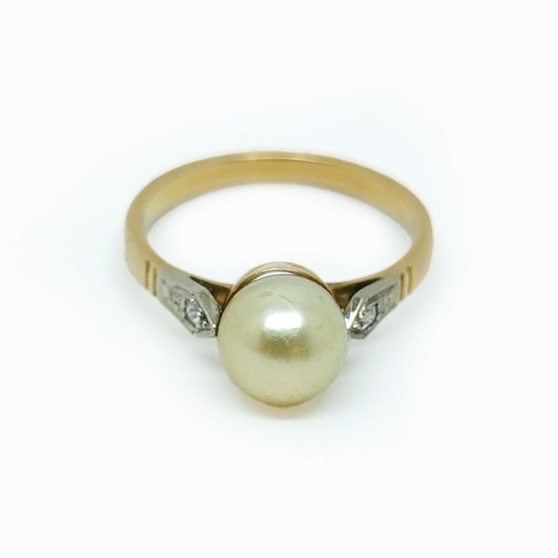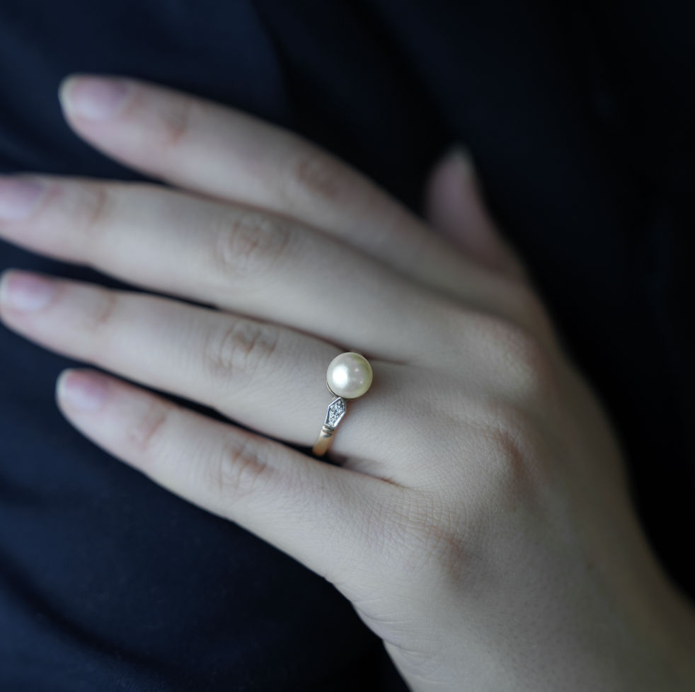 Une jolie bague intemporelle en or et diamant, ornée d’une perle de culture couleur crème.
