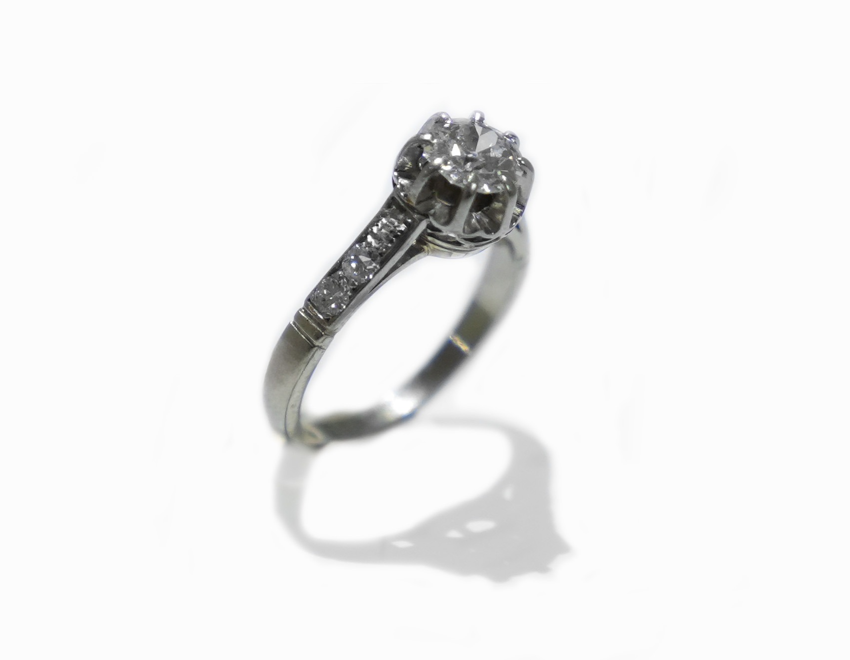 Quatre diamants taille ancienne de chaque côté du corps de bague.