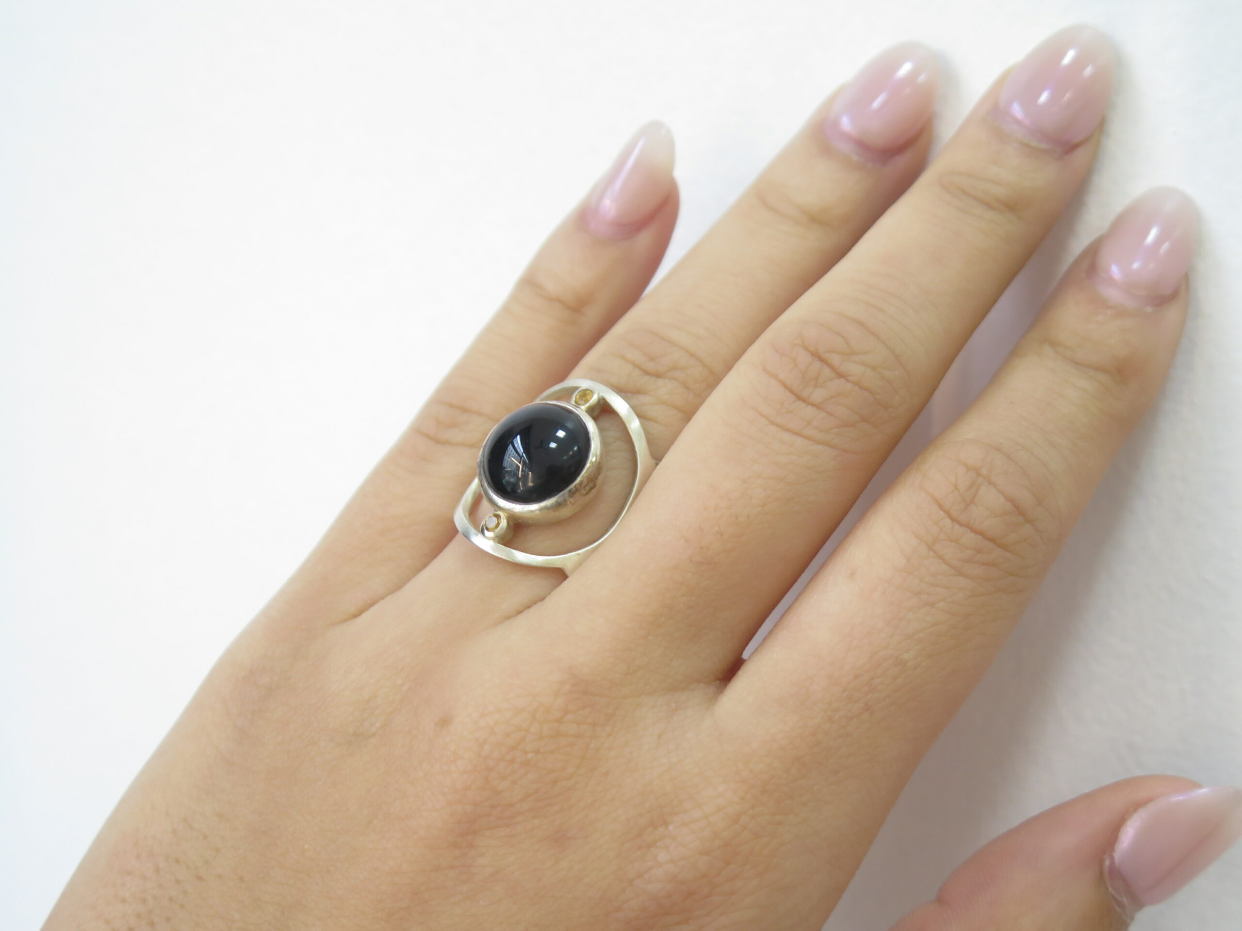 Cette bague en argent est ornée d’un cabochon d’onyx de forme ronde. L’onyx est une variété d’agate, dans la famille des calcédoines. Elle est d’un noir profond et surface est particulièrement lisse. Elle est entourée deux belles citrines facettées, dont la couleur jaune apporte une touche de contraste.