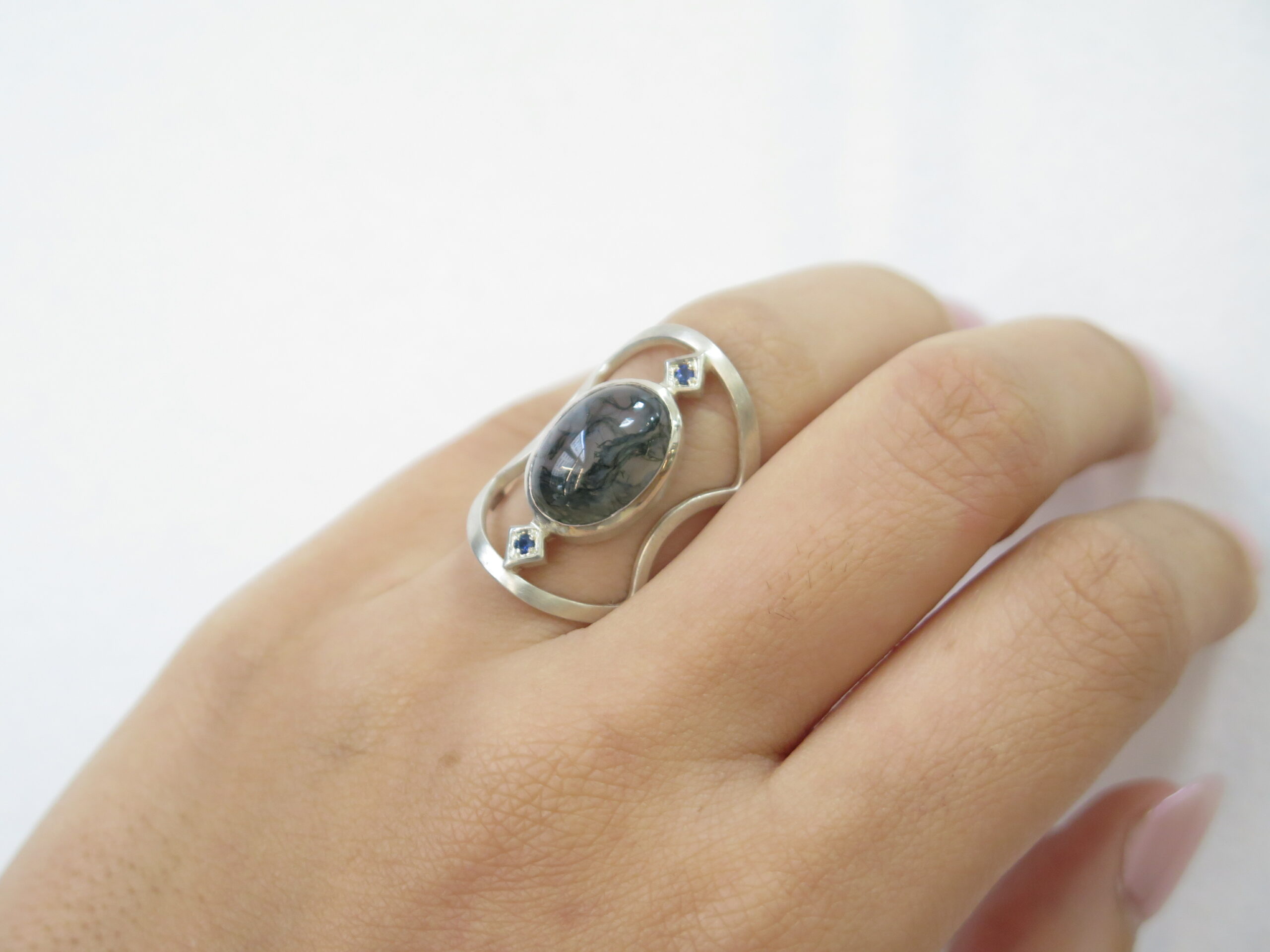 Cette bague large est ornée d’une agate mousse et de deux saphirs.