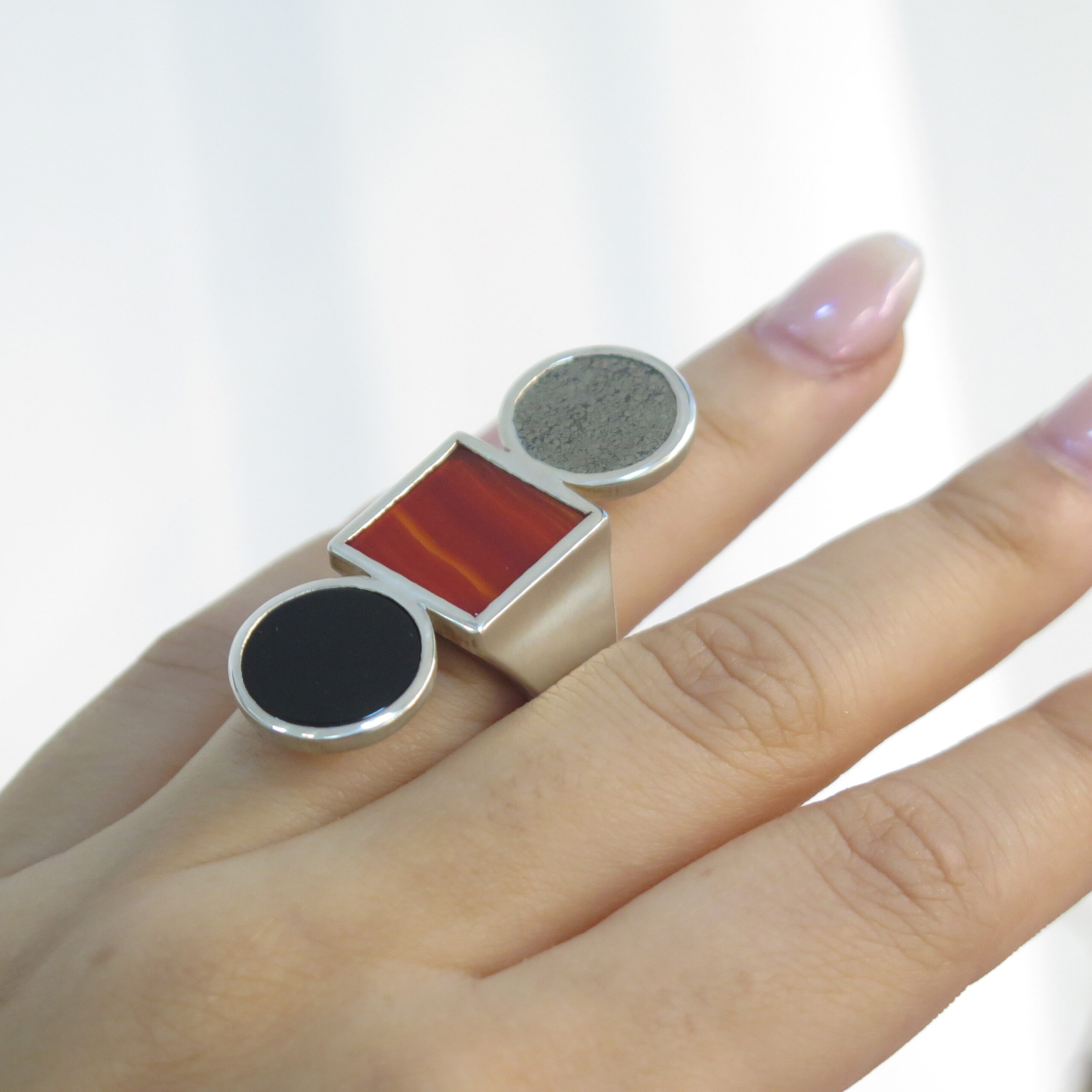 Créée en argent massif, pyrite, cornaline et onyx sa forme massive se positionne très bien sur le doigt.
