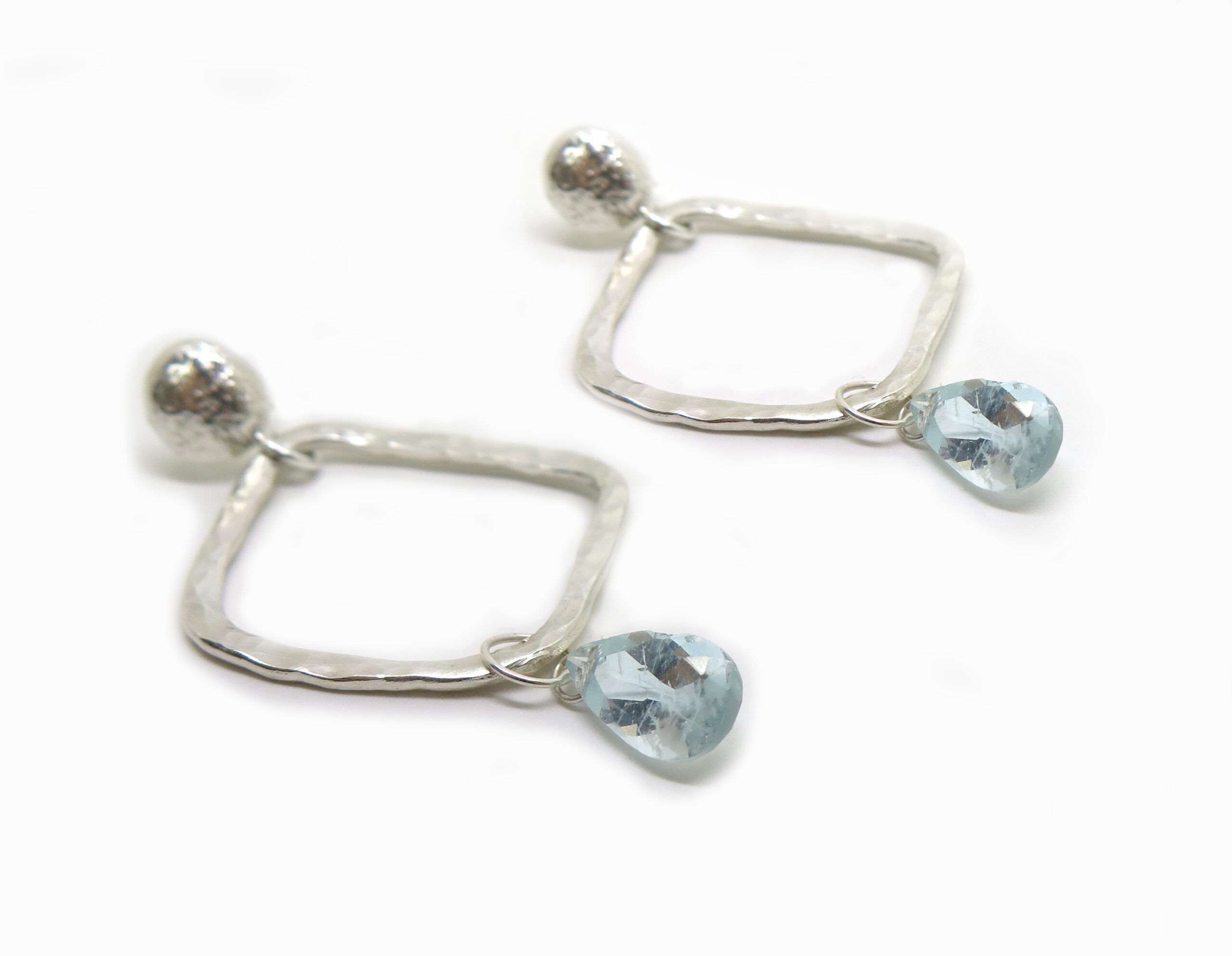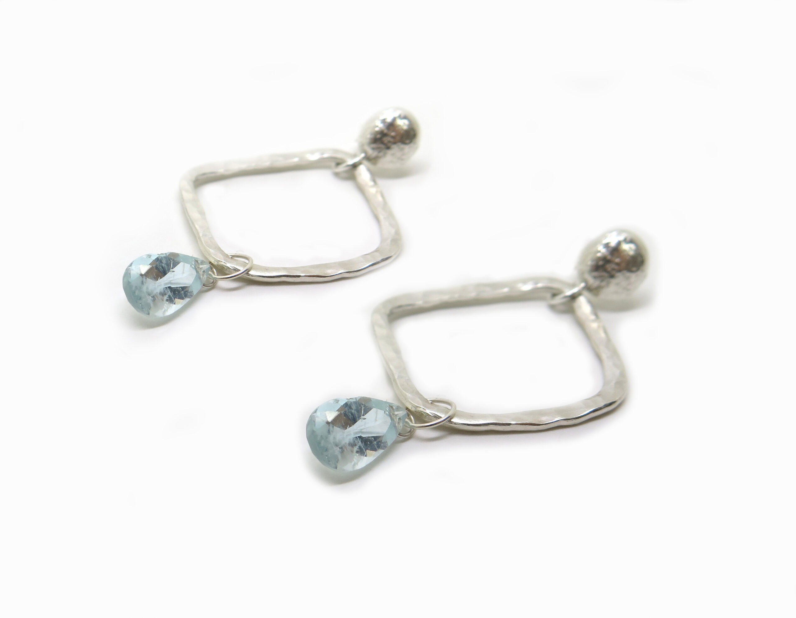 Deux aigues marines en forme de goutte brillent sous ce motif martelé.
