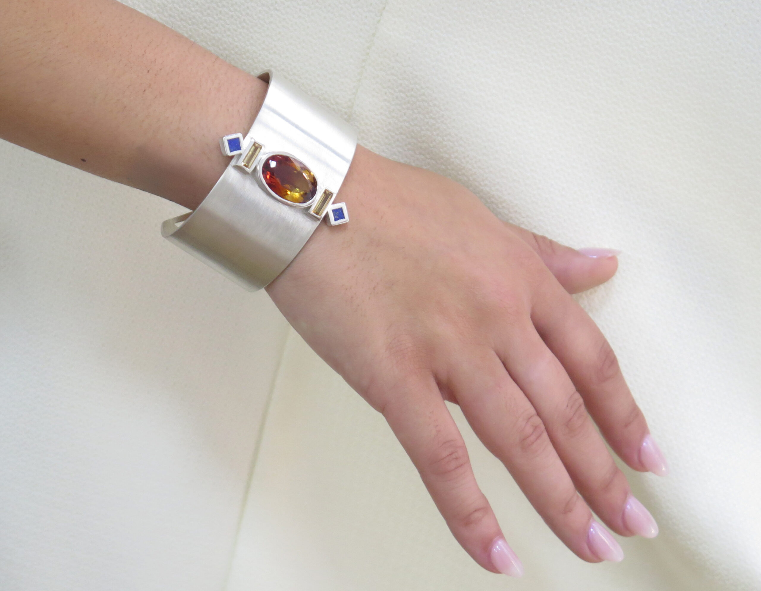 Cette incroyable gemme est mise en valeur par l’éclat de deux citrines rectangles et deux lapis lazulis lumineux.