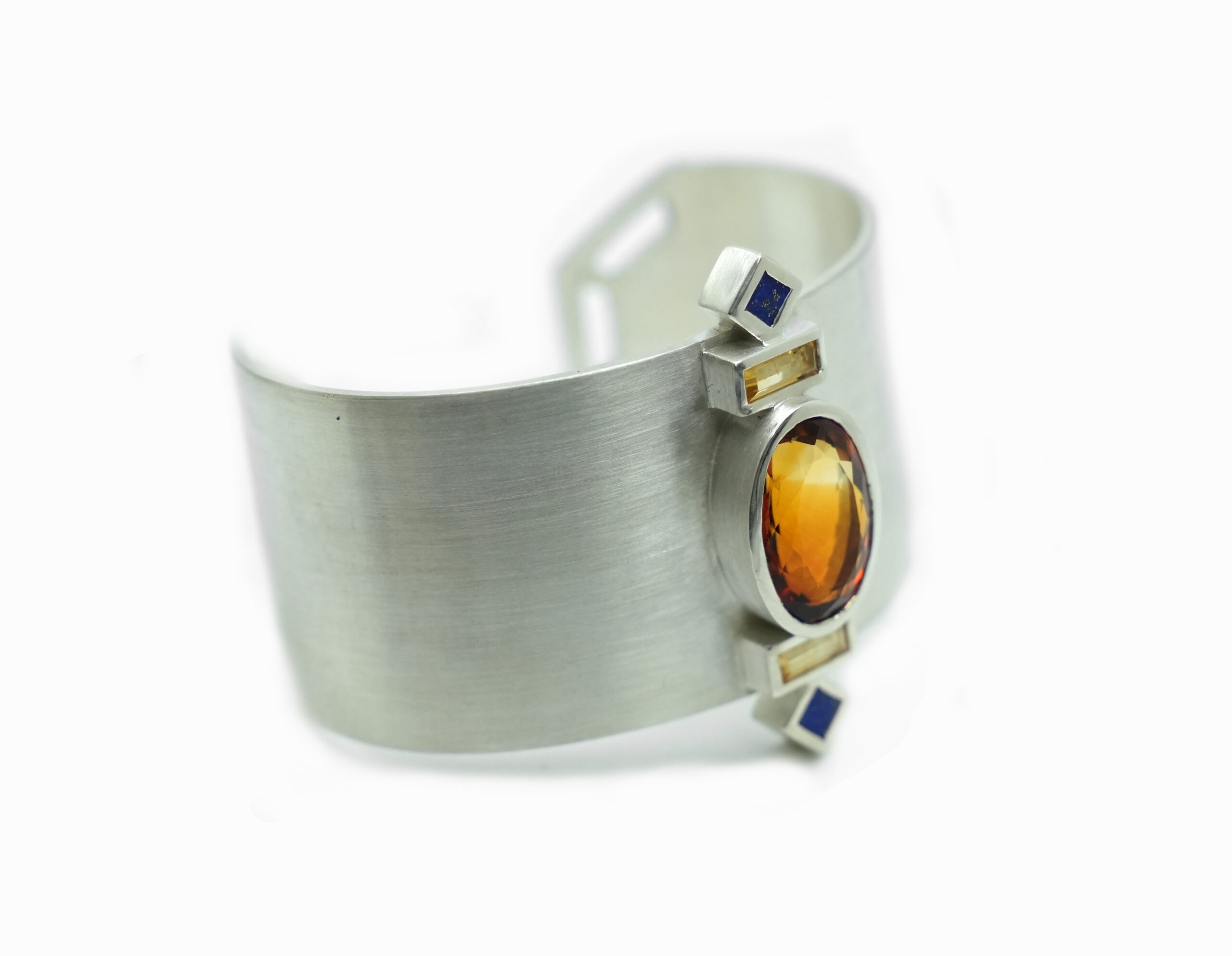 Un large bandeau plat en argent est ornée d’un motif géométrique, serti de pierres fines.