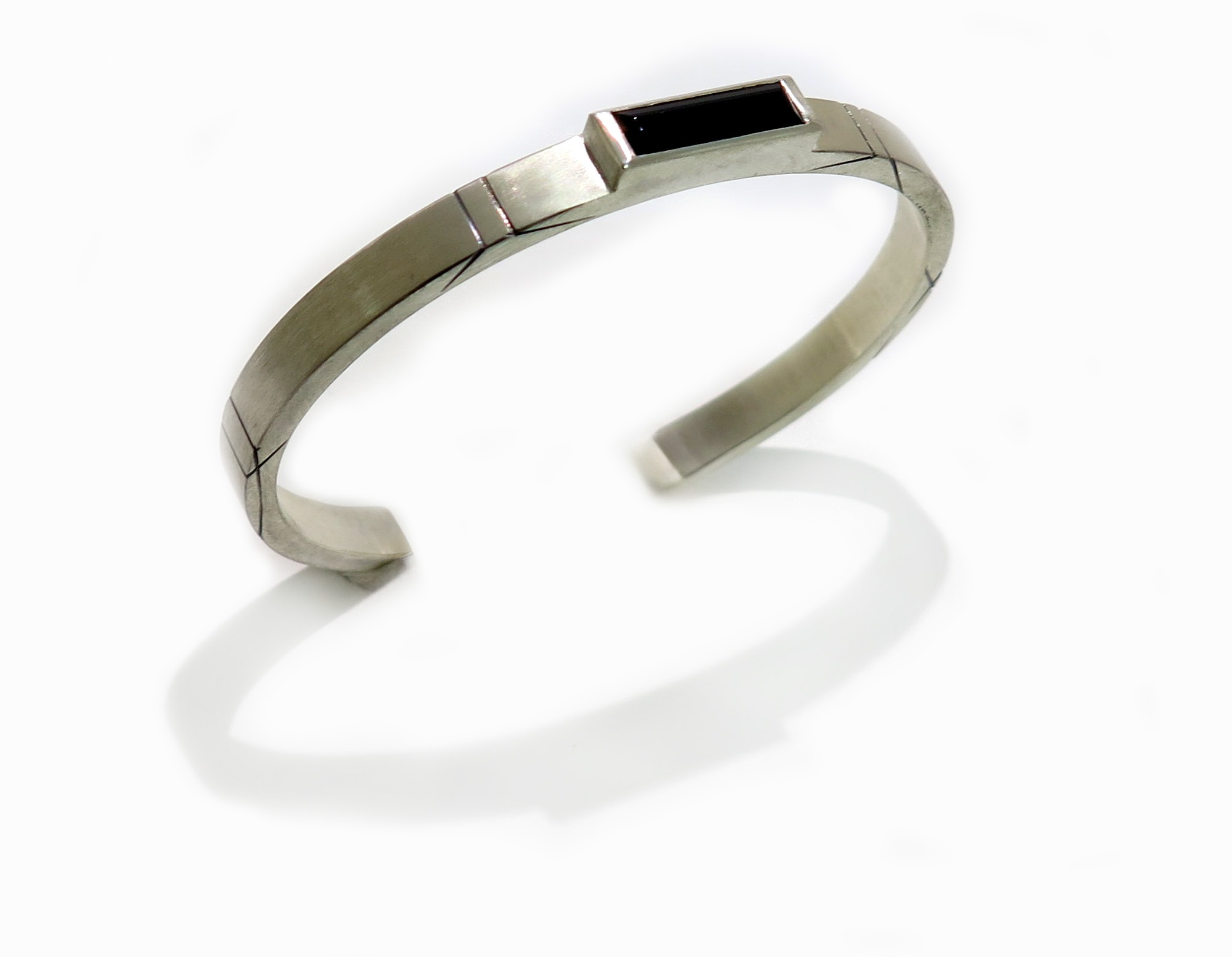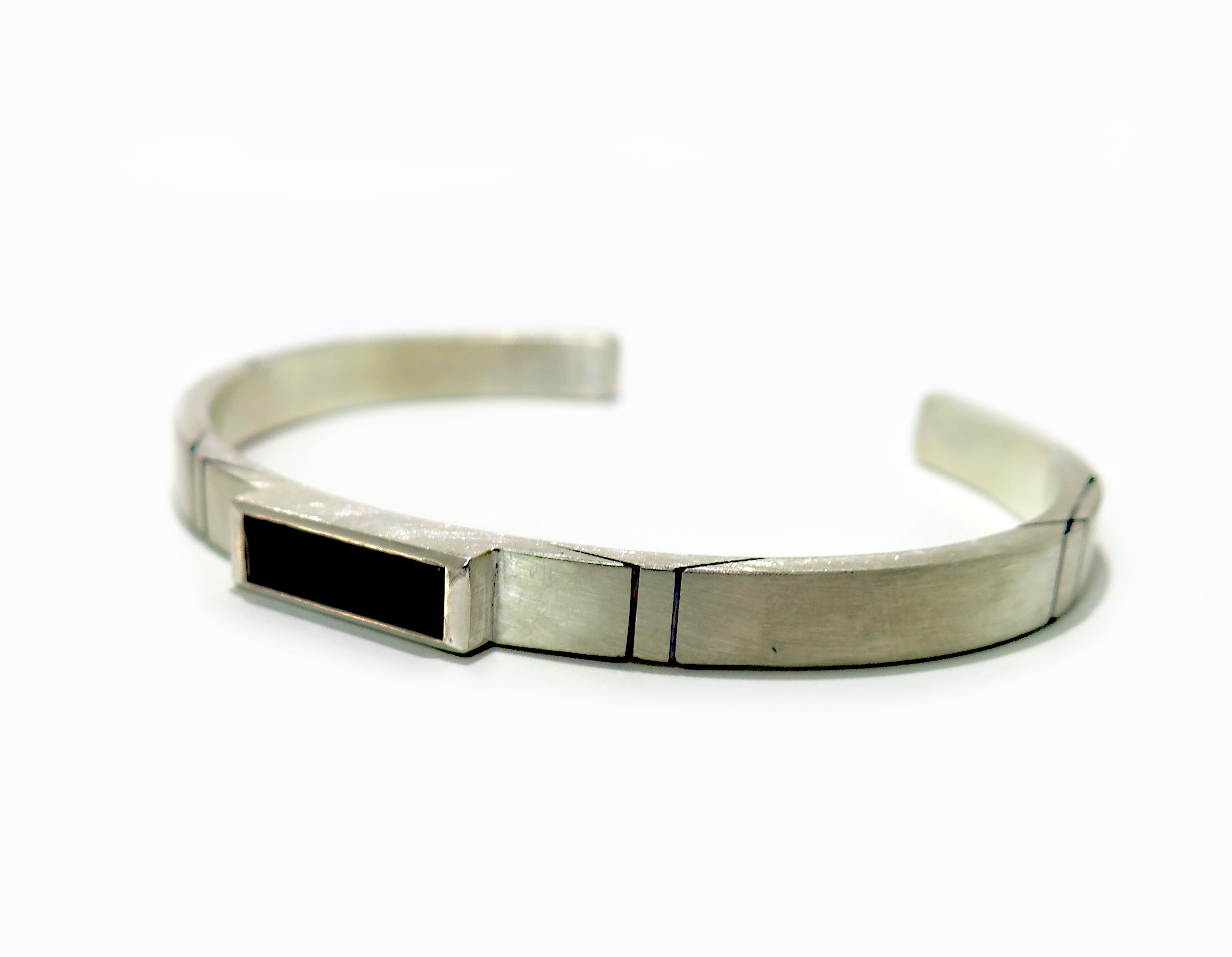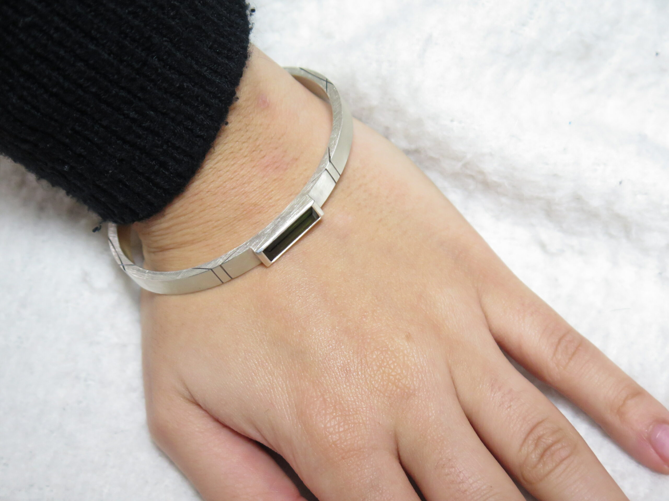 Bracelet rigide en argent massif, orné d’une tourmaline au vert foncé.