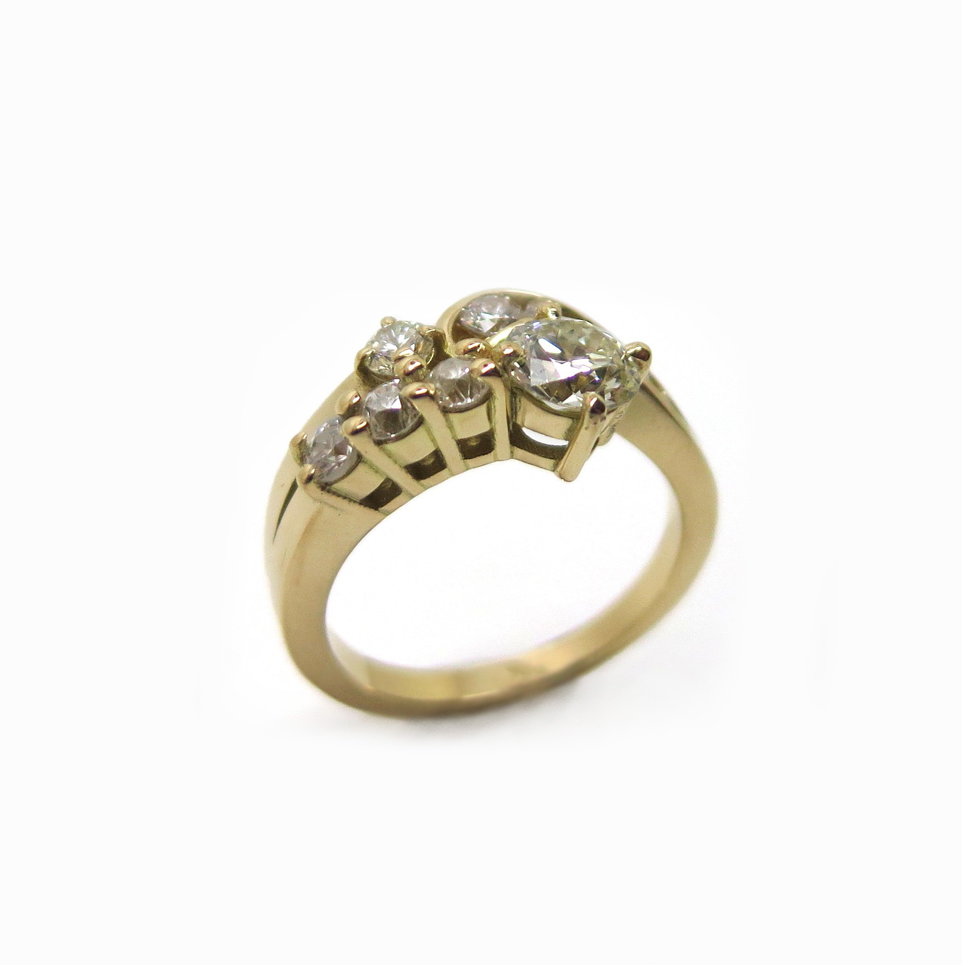 La bague de fiançailles de ma cliente était très abimée. Elle a souhaité que nous redessinions sa forme en incluant tous ses diamants.